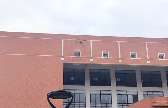 作业现场,搭载高压水枪的擦窗无人机在工作人员遥控下升空。无人机采用系留方式持续获取电力与水源,操作人员借助高清摄像头实时监控,精准调控水枪压力与角度,仅用一小时便将马蜂窝彻底清除。